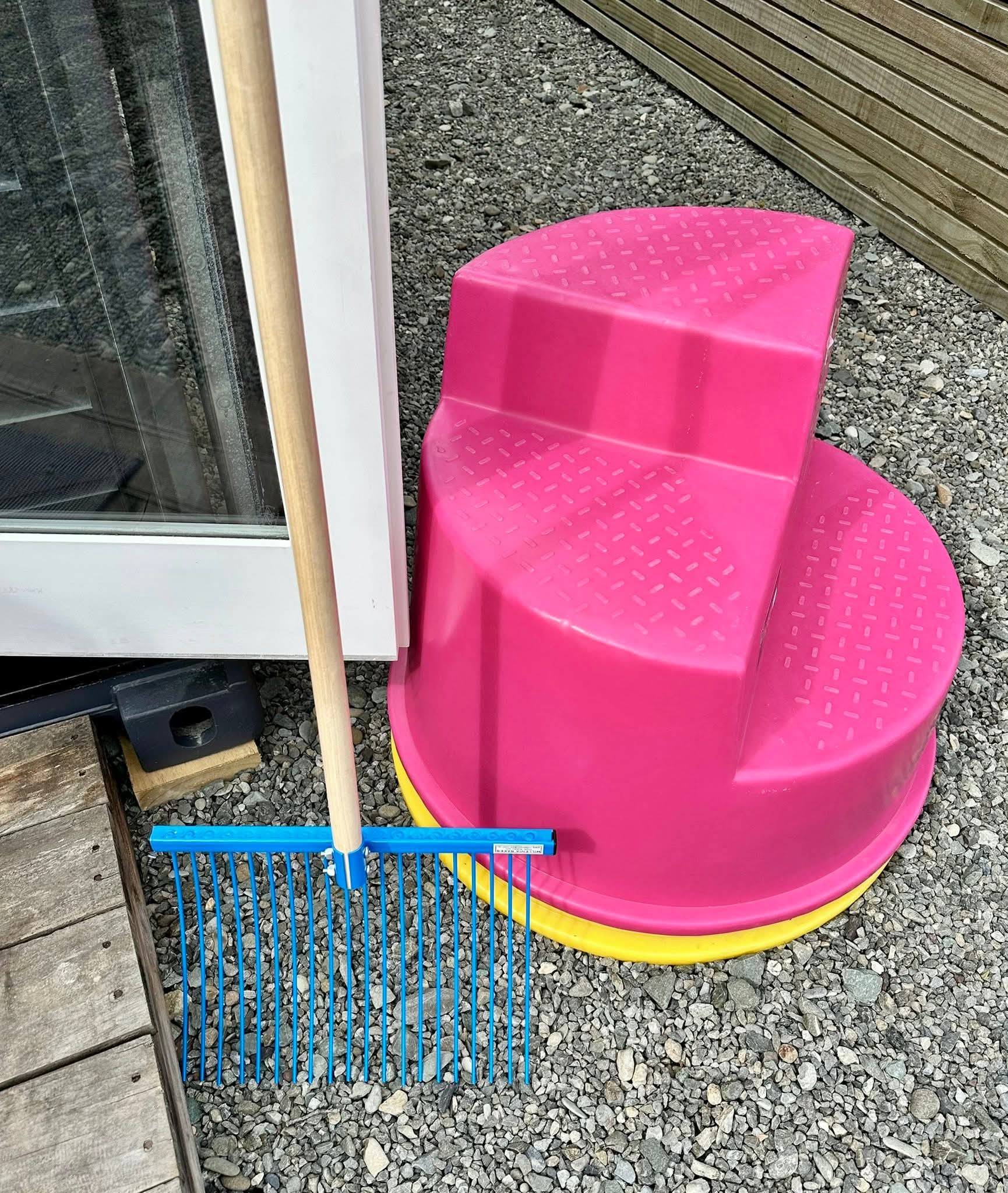This stable rake features 390mm wide, 20 spring steel tines each 280mm long, available in six vibrant colours. It comes with a sturdy, classic hardwood handle for easy, reliable use.