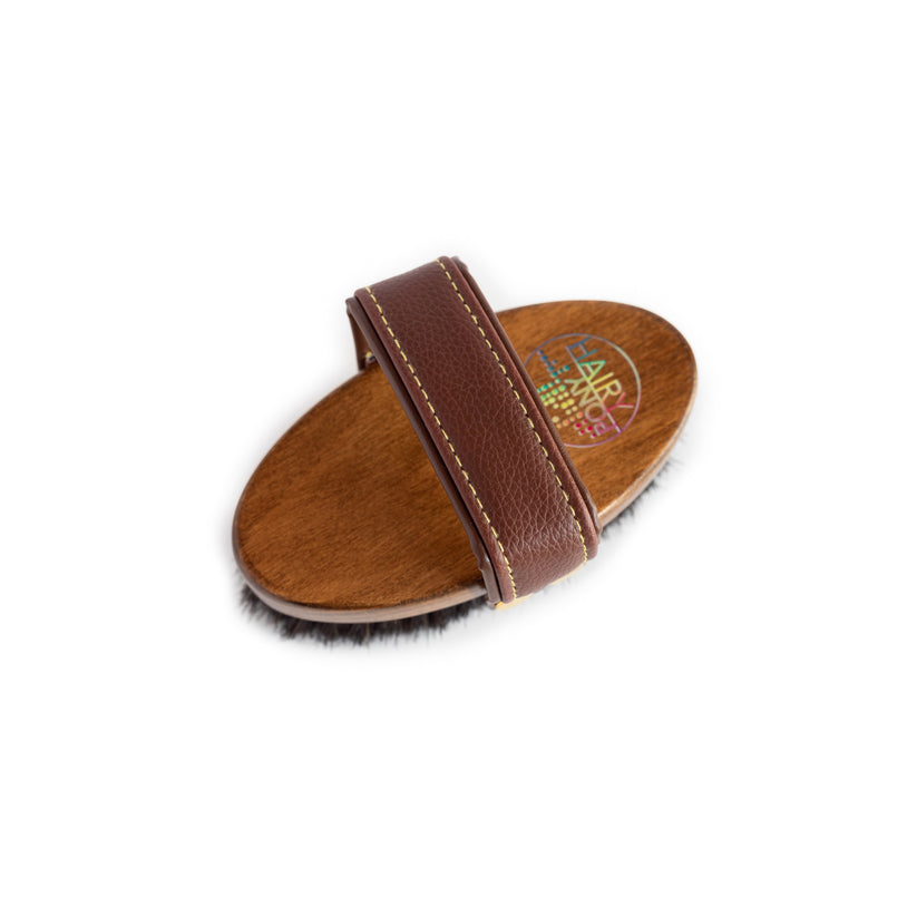 The HAIRY PONY MINI HORSE BODY BRUSH is just the right size and shape for little hands! Crafted from the same top-quality beechwood as our original brush, it features soft, densely-packed natural bristles that make grooming a breeze for kids. With its comfy padded handle, eye-catching gold accents, and a cheerful rainbow logo, this mini brush adds a splash of fun to grooming time. It measures about 13cm long by 7cm wide—perfect for tiny hands!