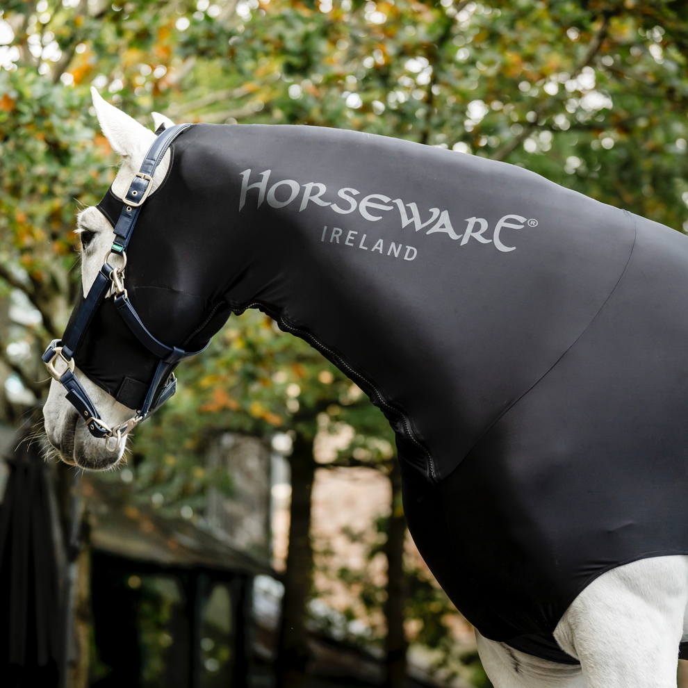 Stretch Lycra show hood designed to keep the horse clean and shiny. Features secure zip fastenings, front leg arches for freedom of movement, and anti-static fabric to help maintain a sleek coat in the show ring.